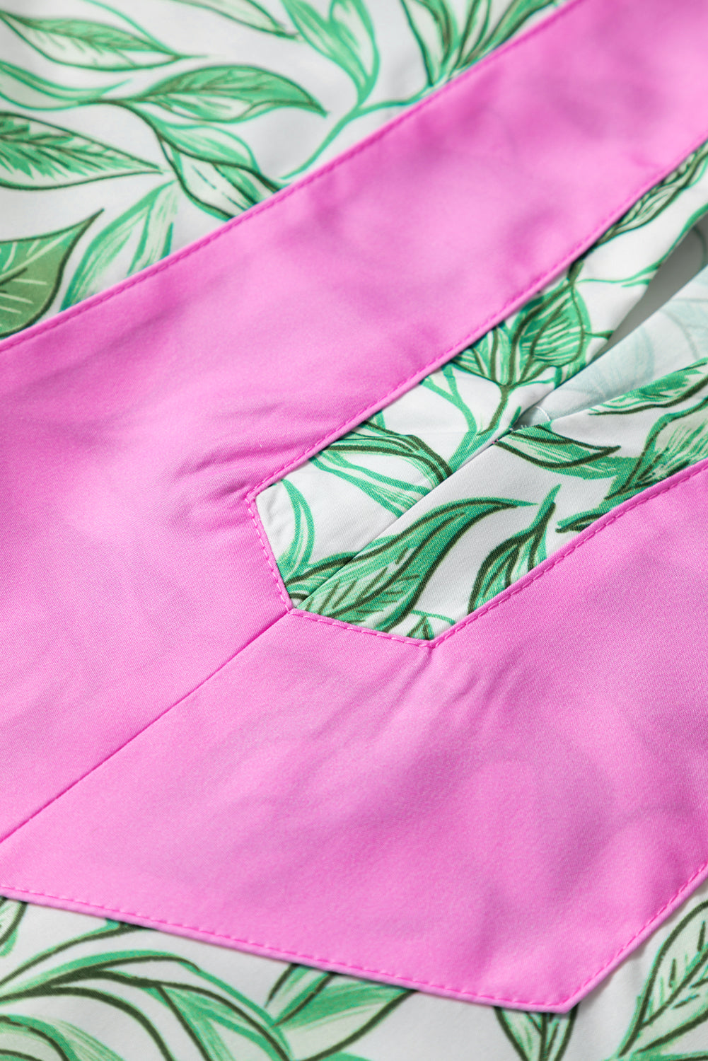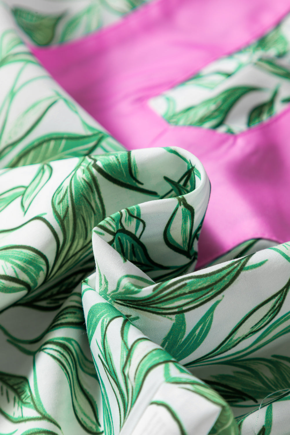 Green Leaves Pattern Color Block V Neck Puff Blouse