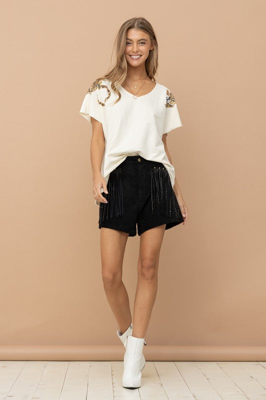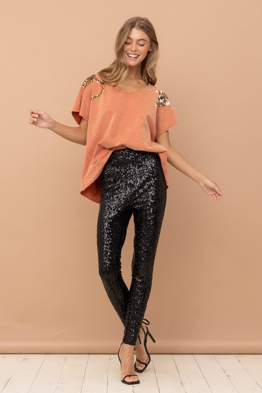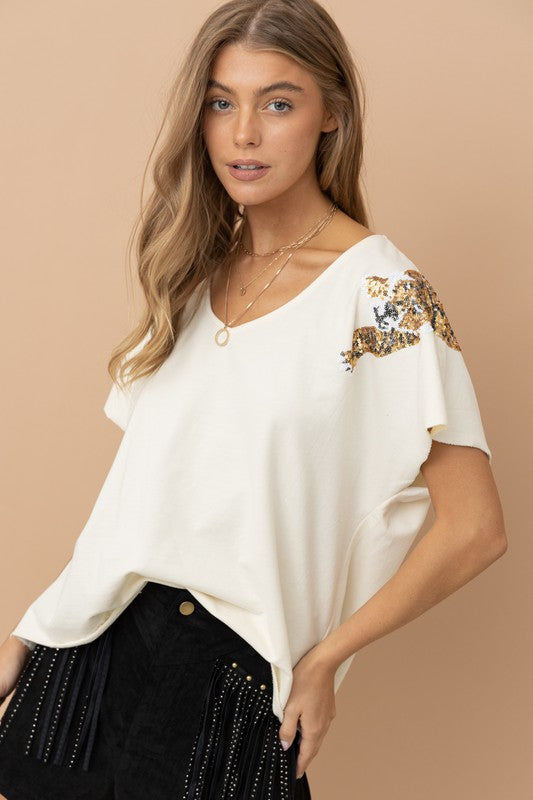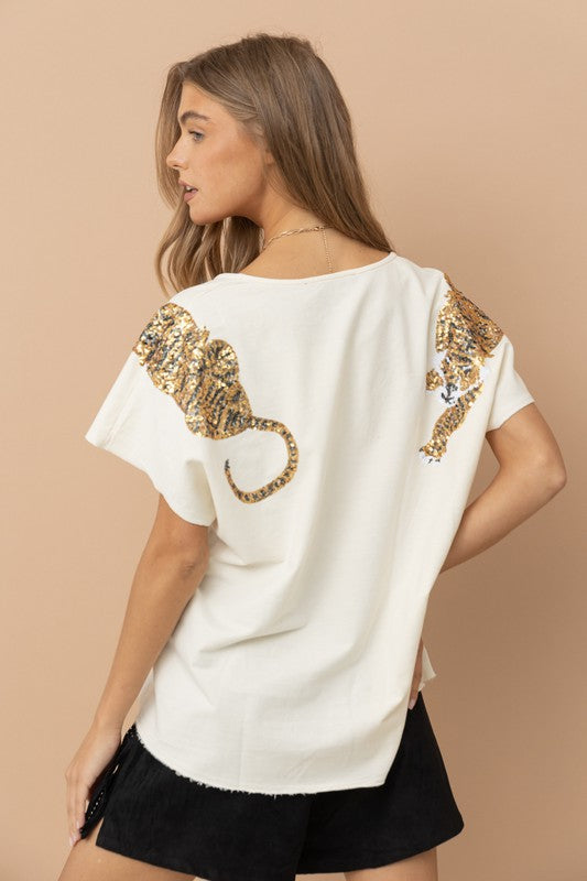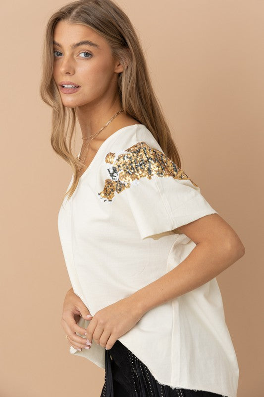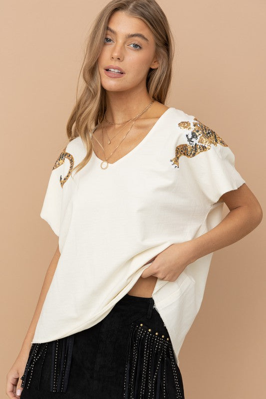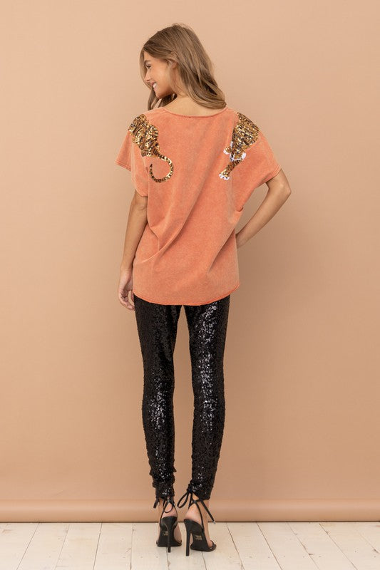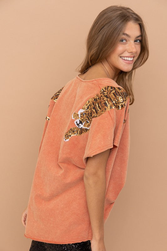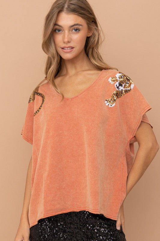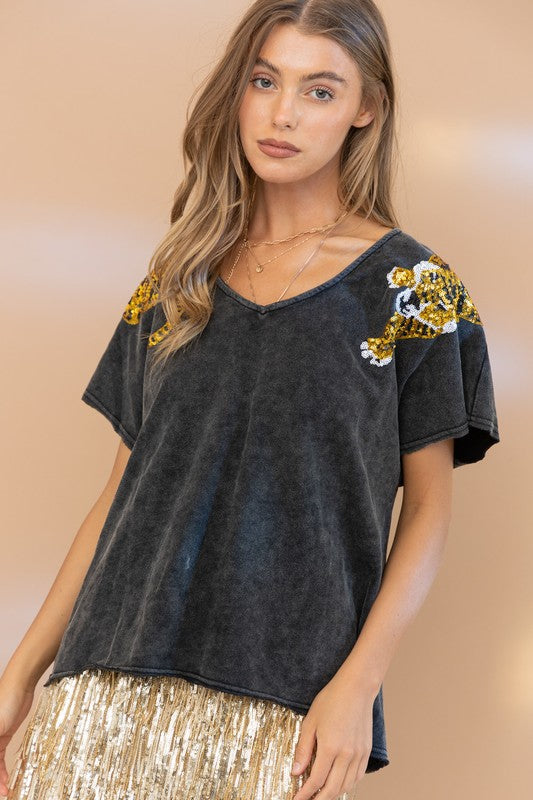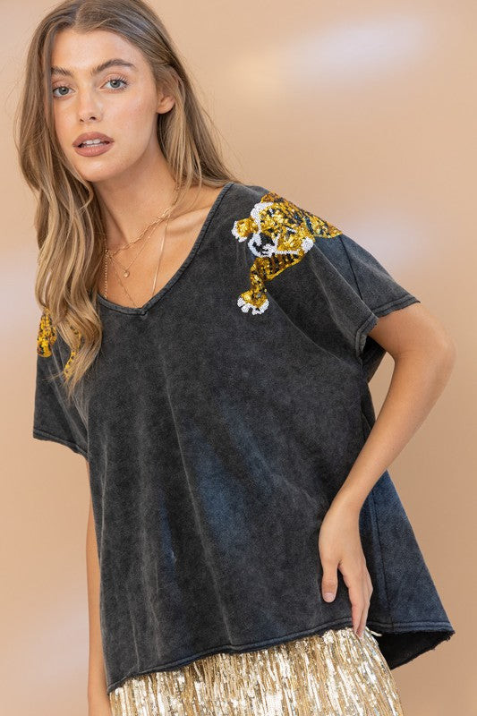 Elevate your style with our Garment Washed V Neck Tiger Sequin Patch T Shirt. The drop shoulder design and soft fabric ensure comfort, while the tiger sequin patch adds a hint of glamour. Perfect for both casual outings and chic nights out.